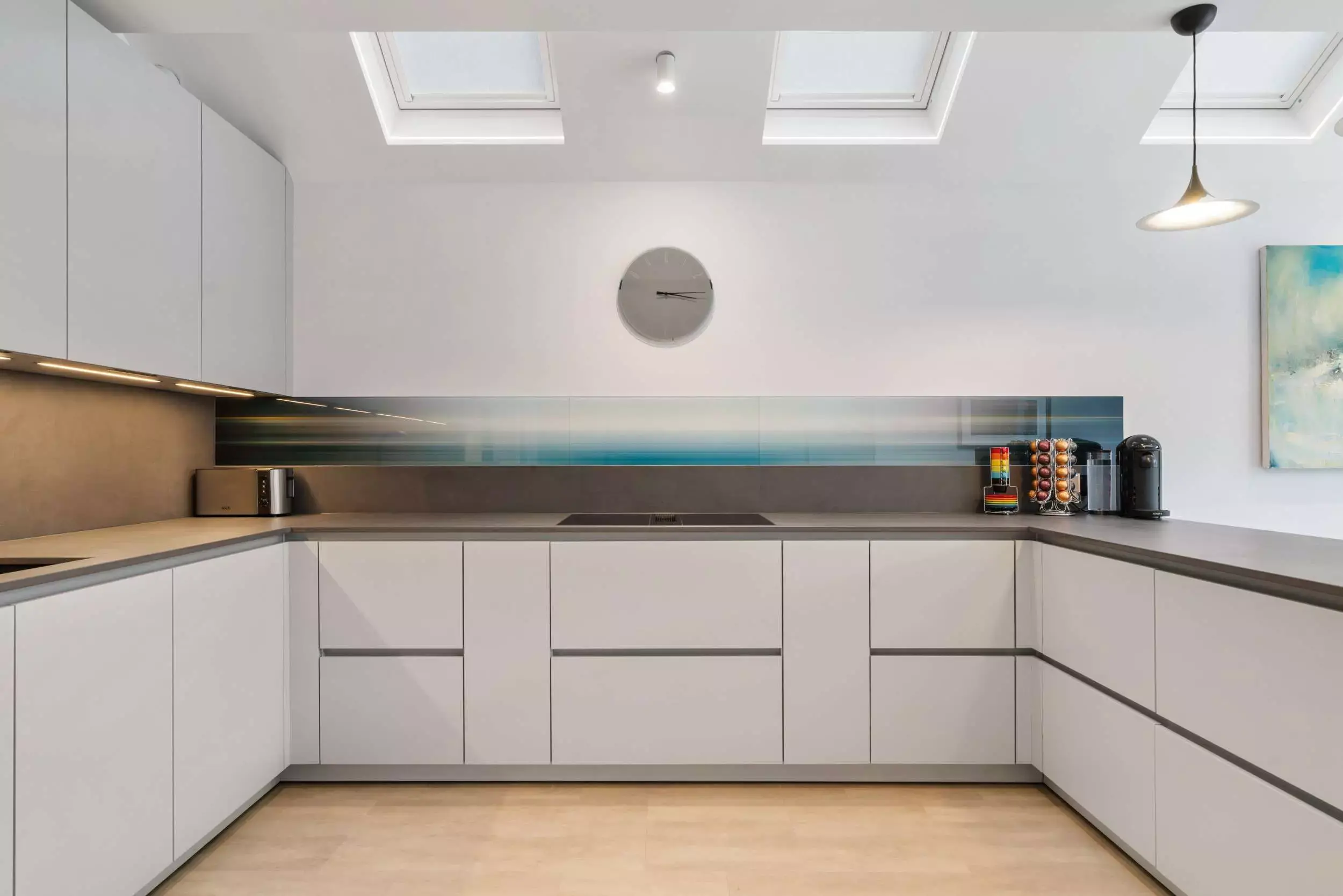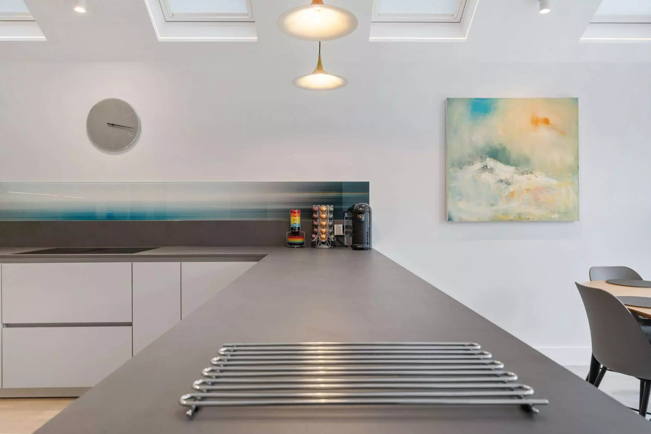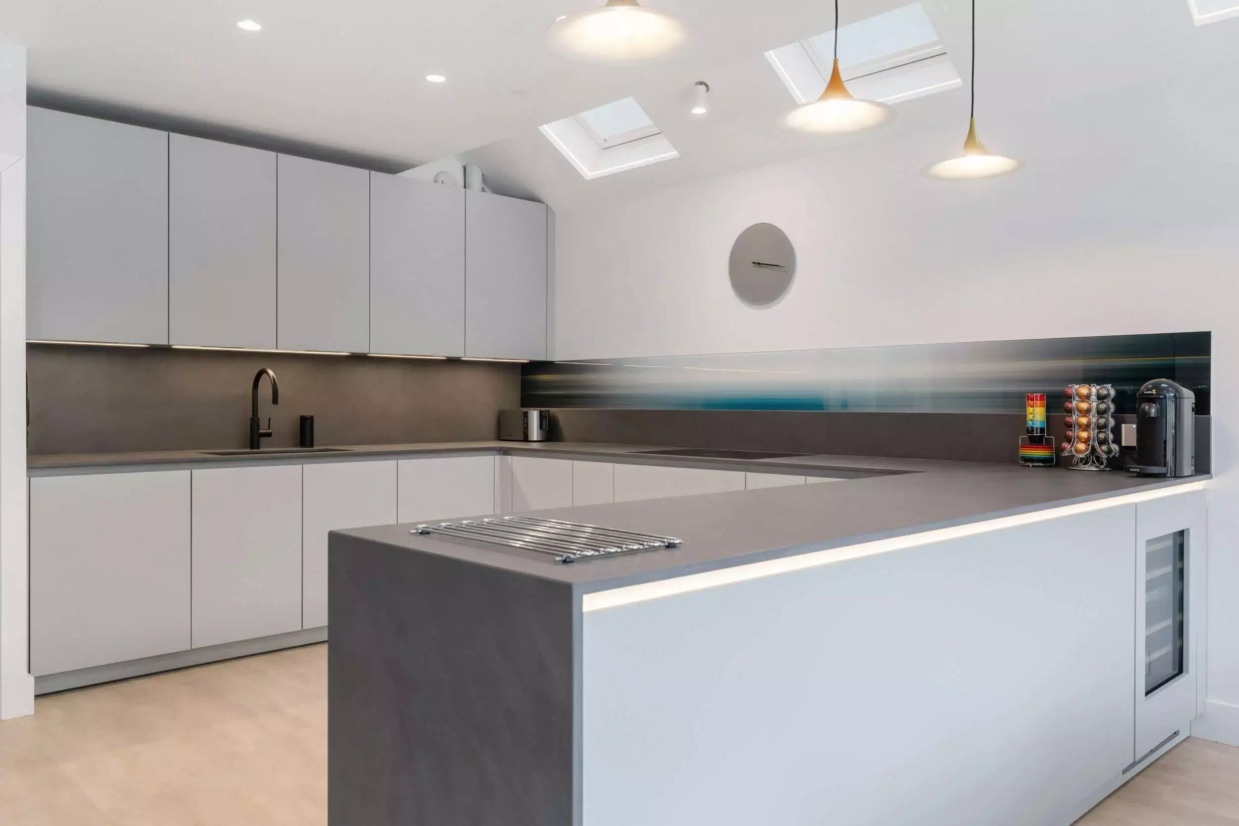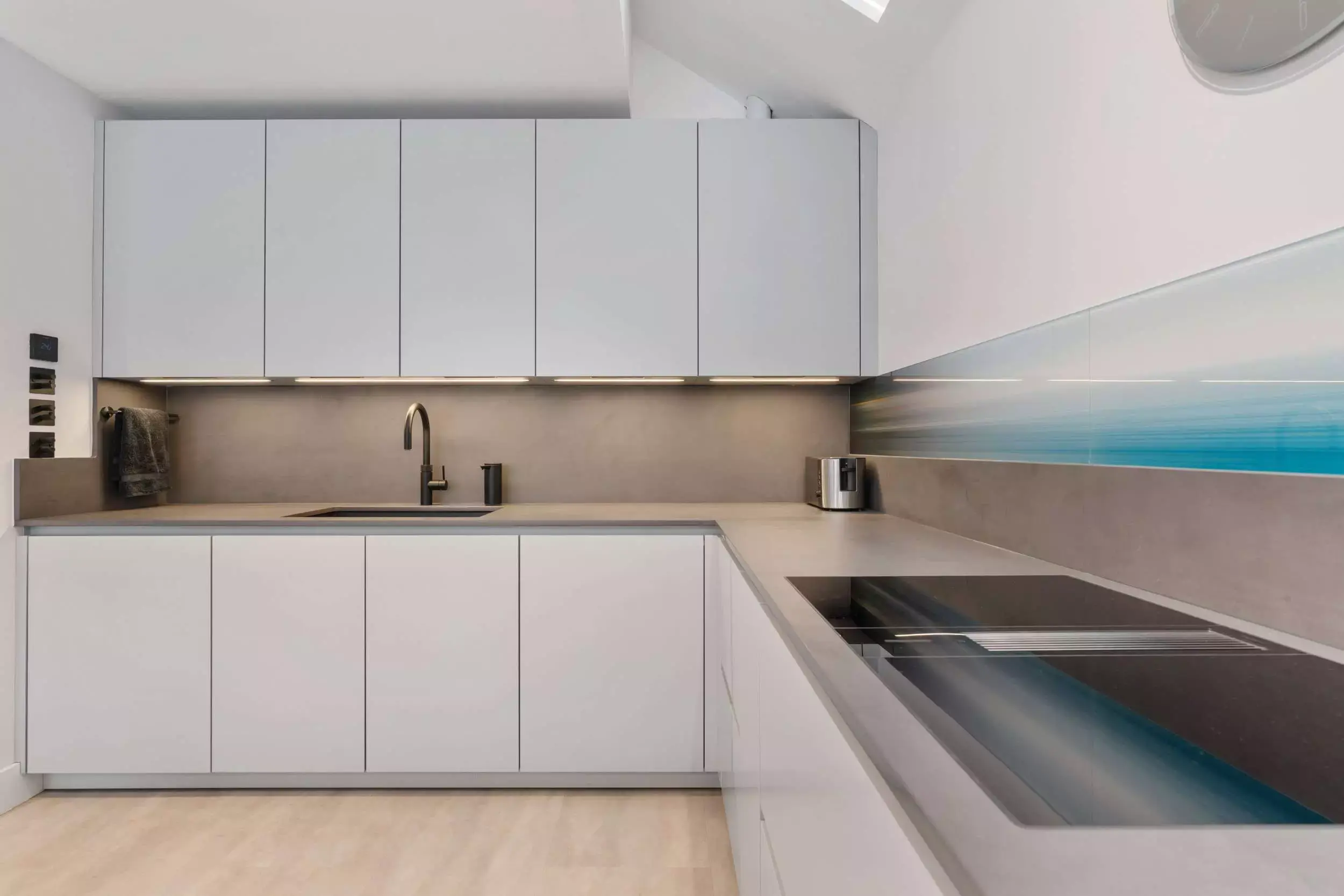 Contemporary Grey Open-Plan Kitchen. Seamlessly designed with handleless cabinets and BORA integrated appliances. It boasts luxurious Dekton countertops accented by bold black accents. Unique glass art backsplash.