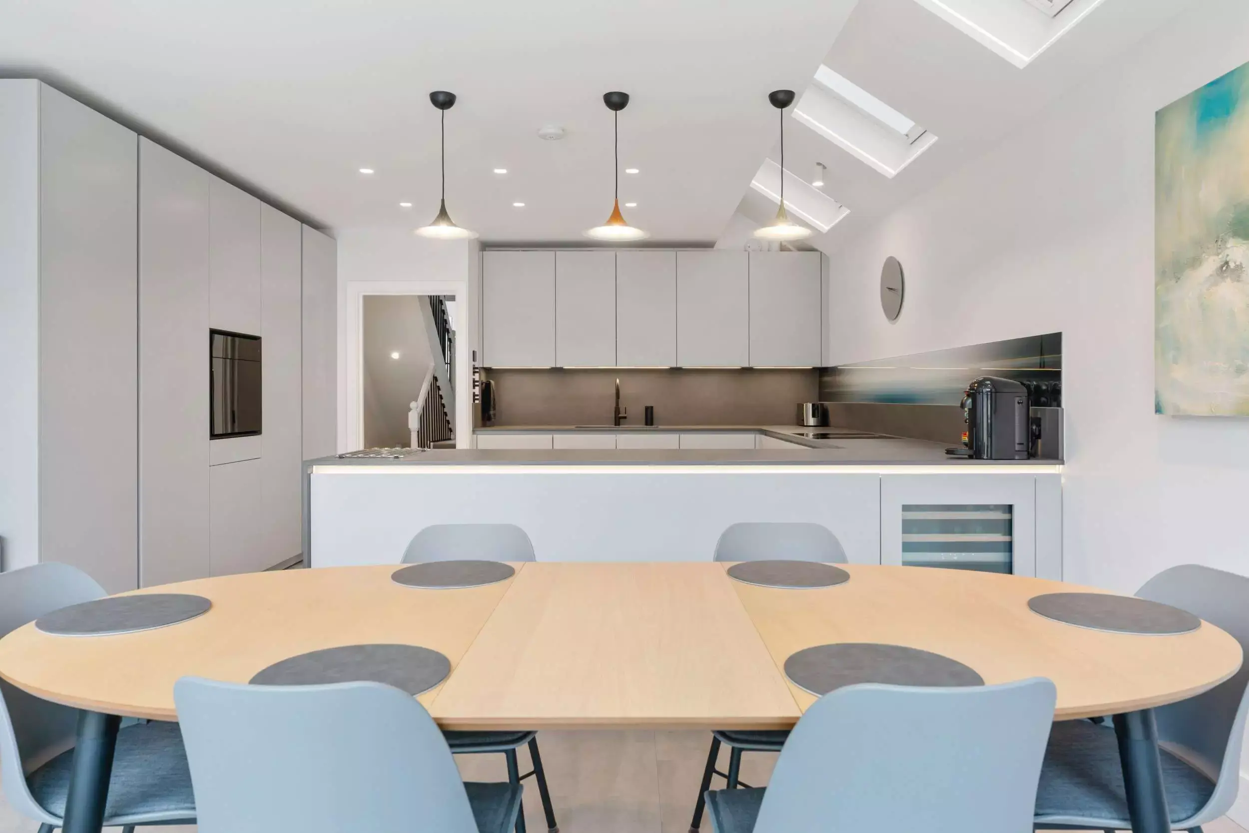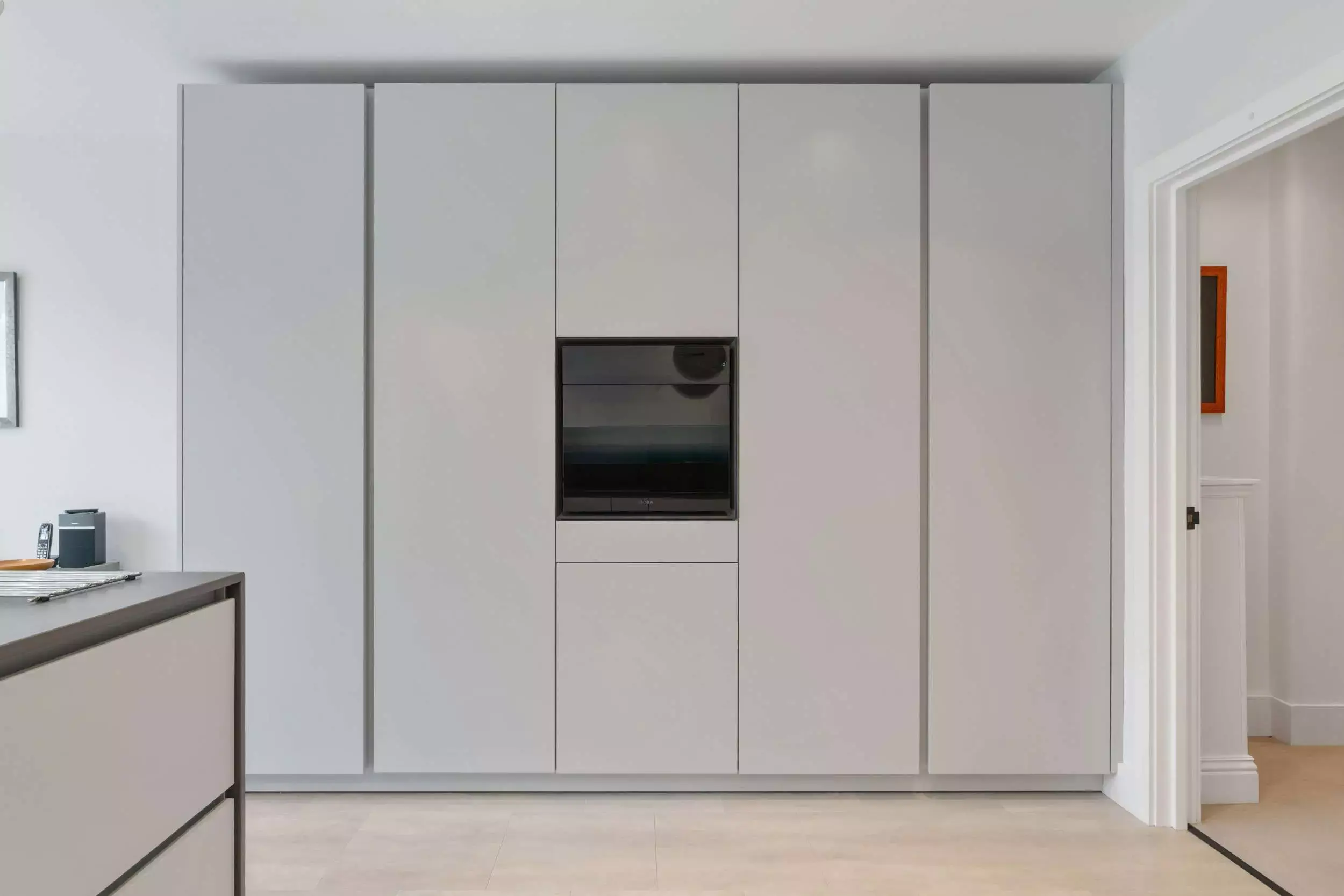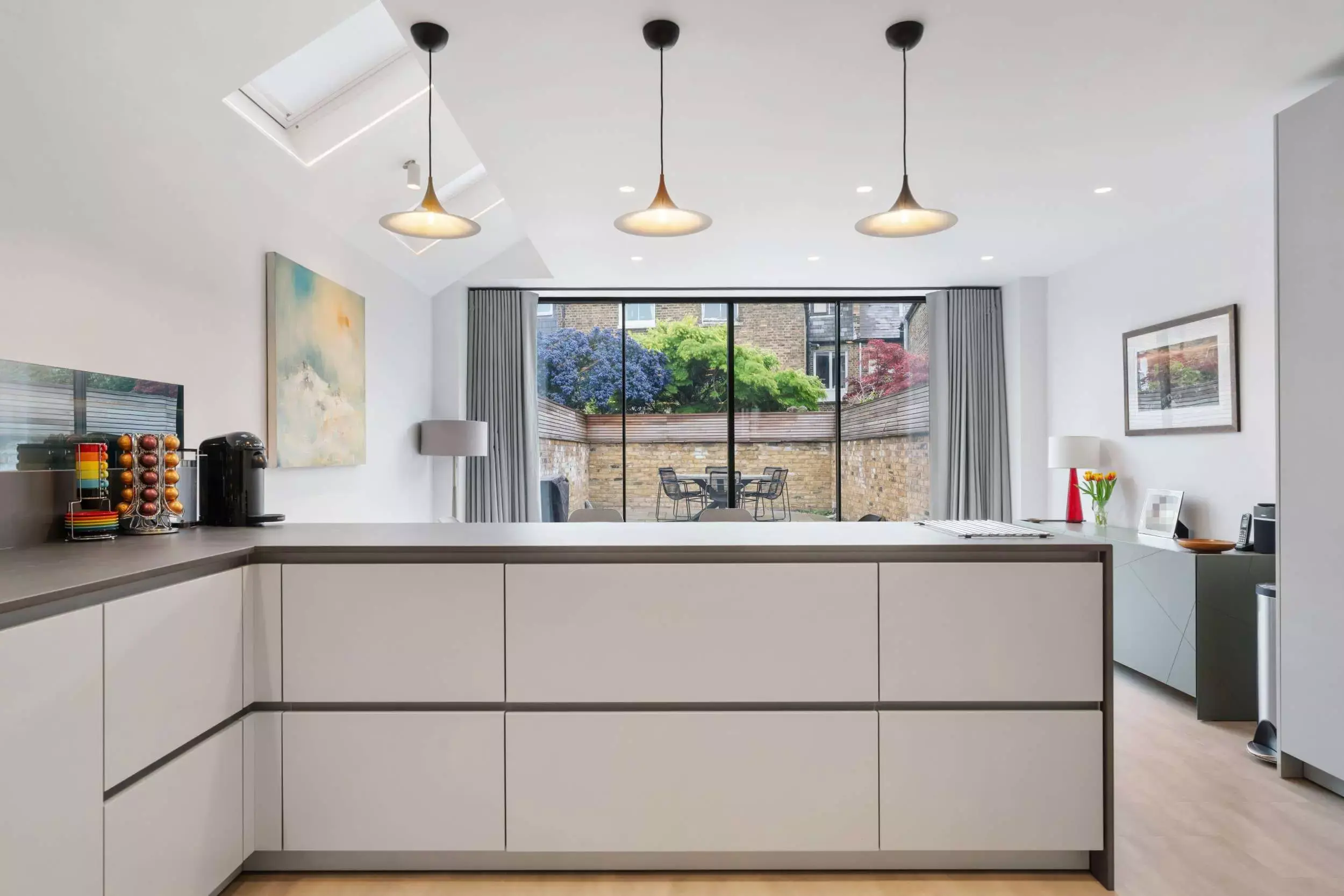Contemporary Grey Open-Plan Kitchen. Seamlessly designed with handleless cabinets and BORA integrated appliances. It boasts luxurious Dekton countertops accented by bold black accents. Unique glass art backsplash.