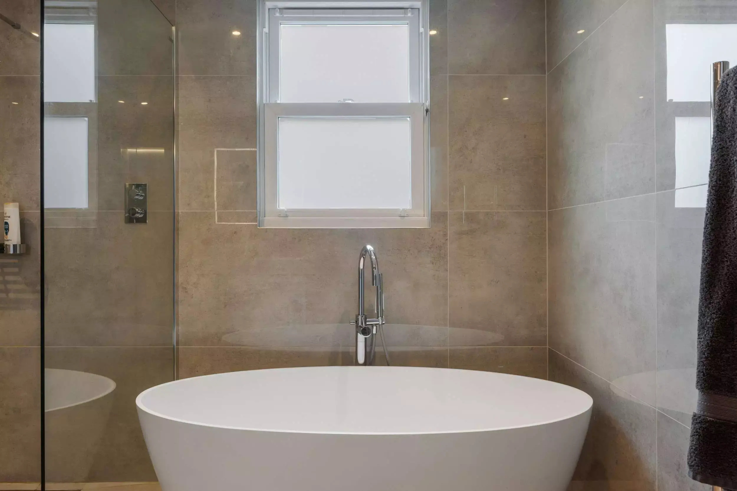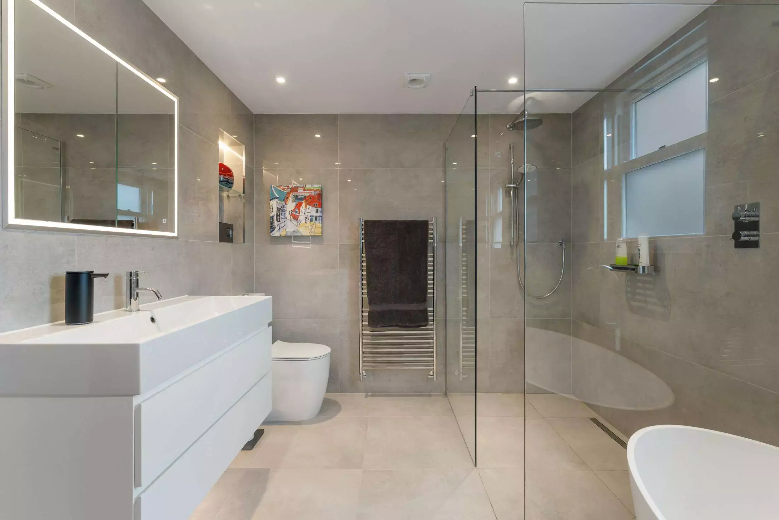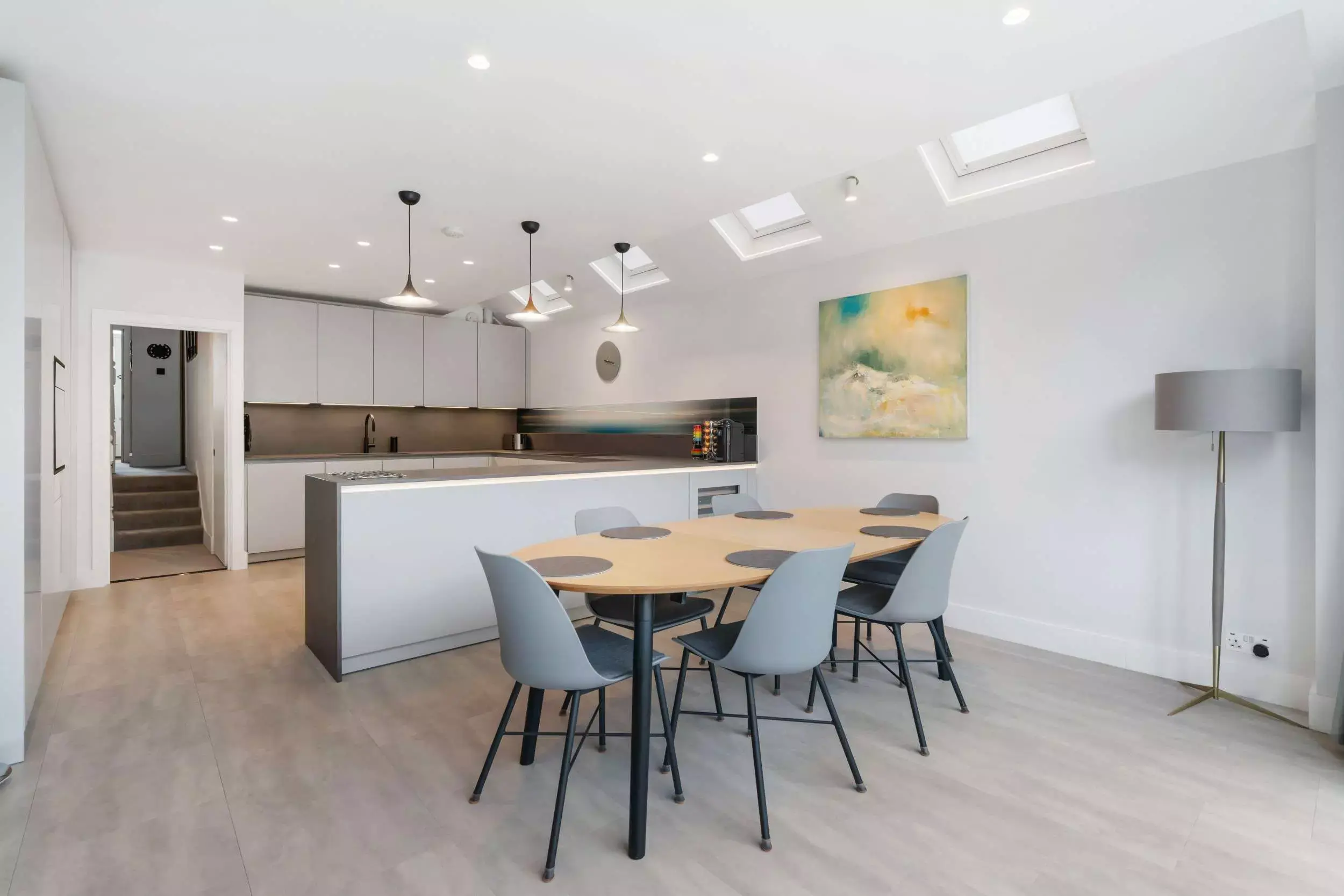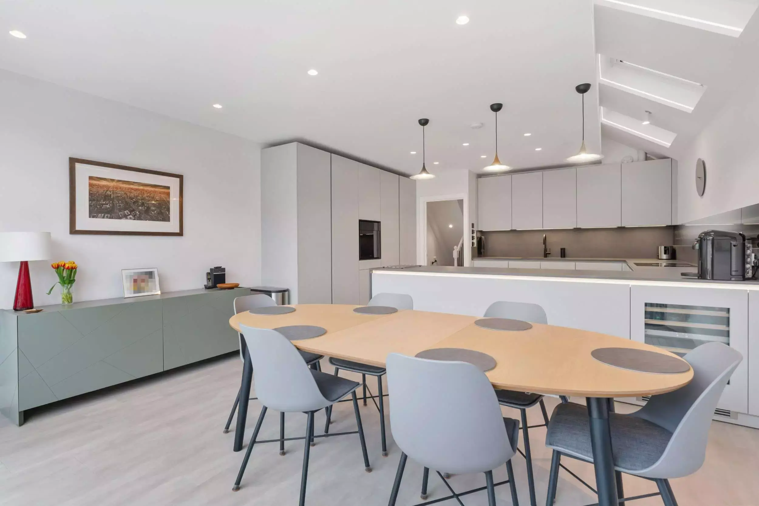 Contemporary Grey Open-Plan Kitchen. Seamlessly designed with handleless cabinets and BORA integrated appliances. It boasts luxurious Dekton countertops accented by bold black accents. Unique glass art backsplash.