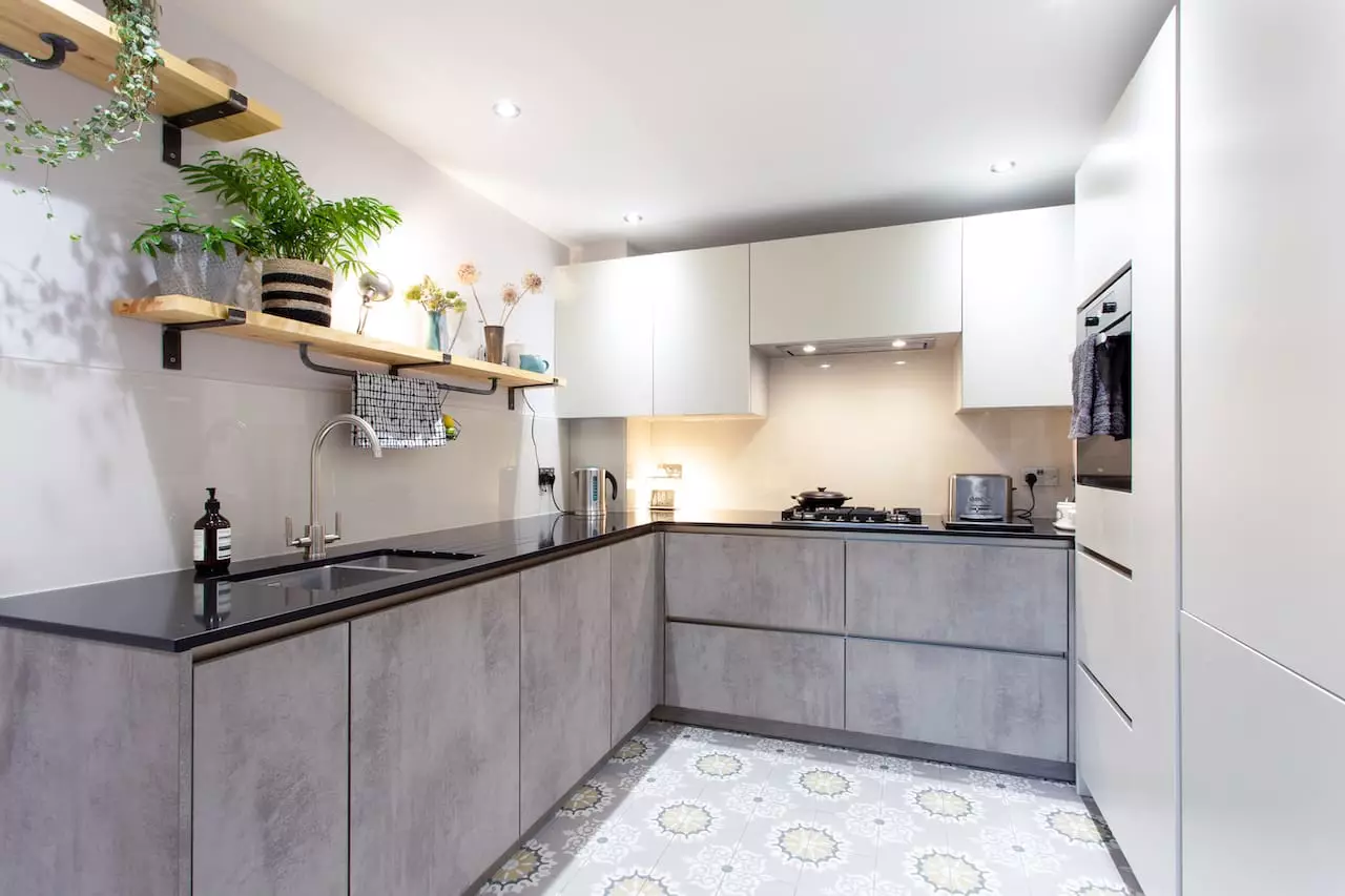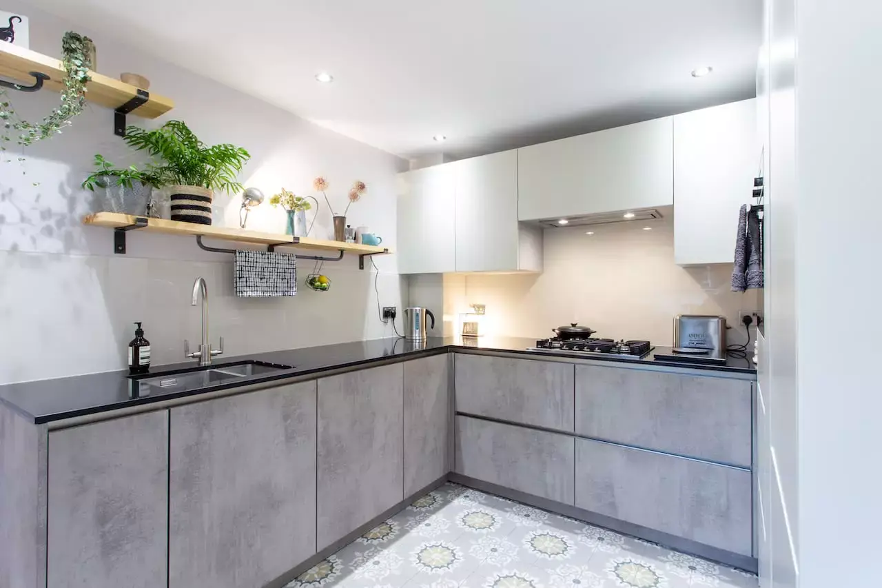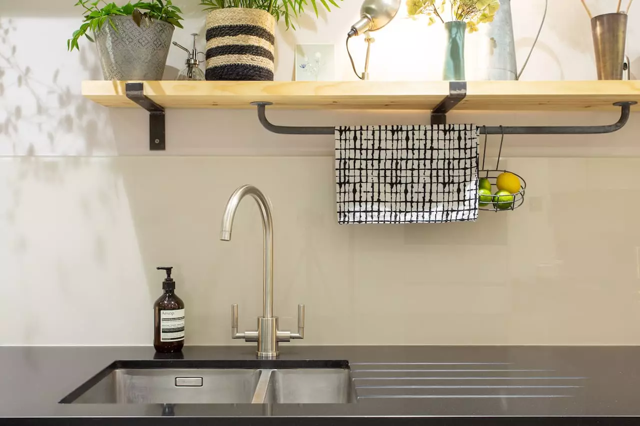 Internal refurbishment, creating a more functional, modern kitchen with industrial open shelving.