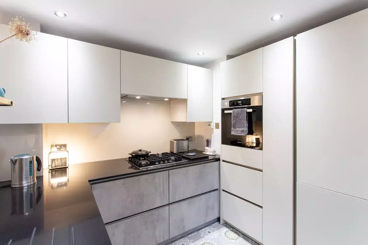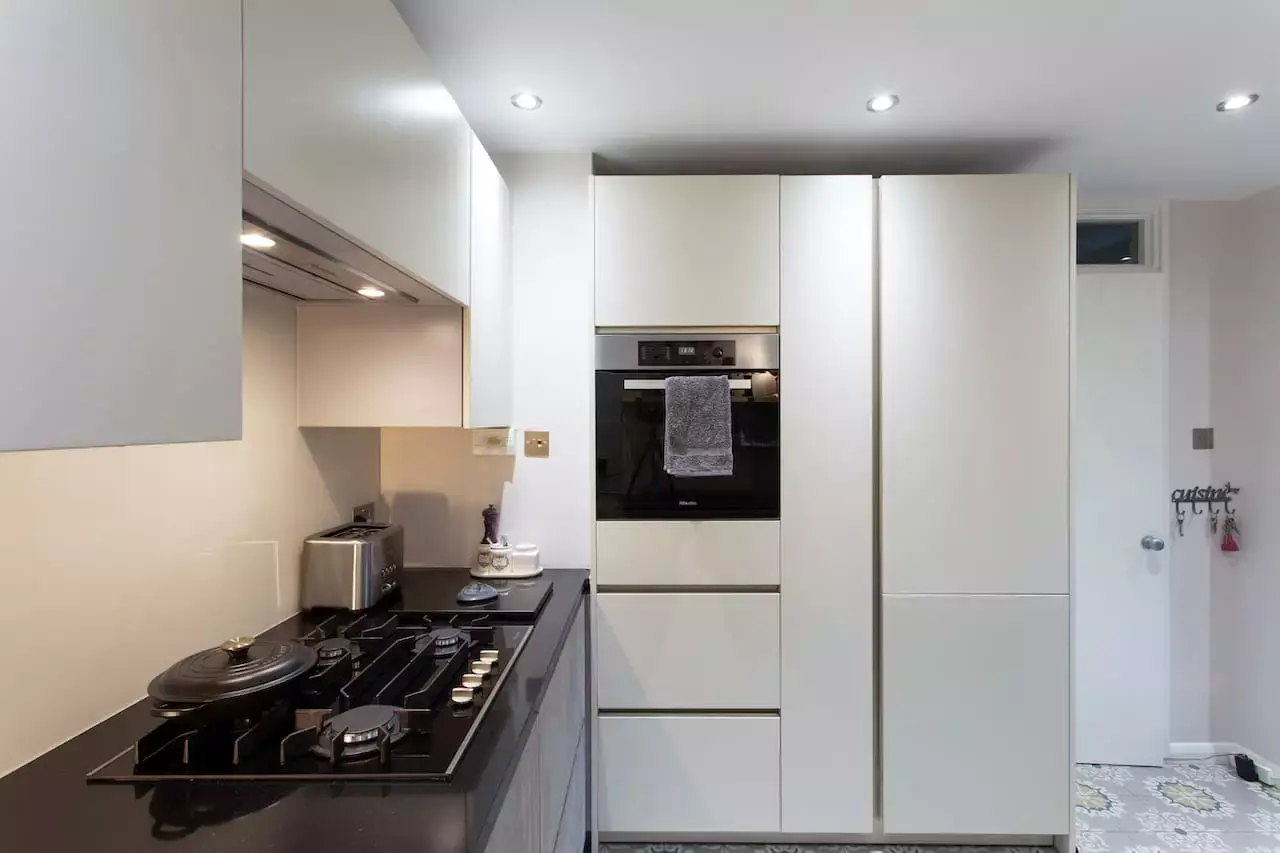 Contemporary, subtle industrial warm grey pallet. Matt lacquered warm white furniture paired with concrete look doors.
