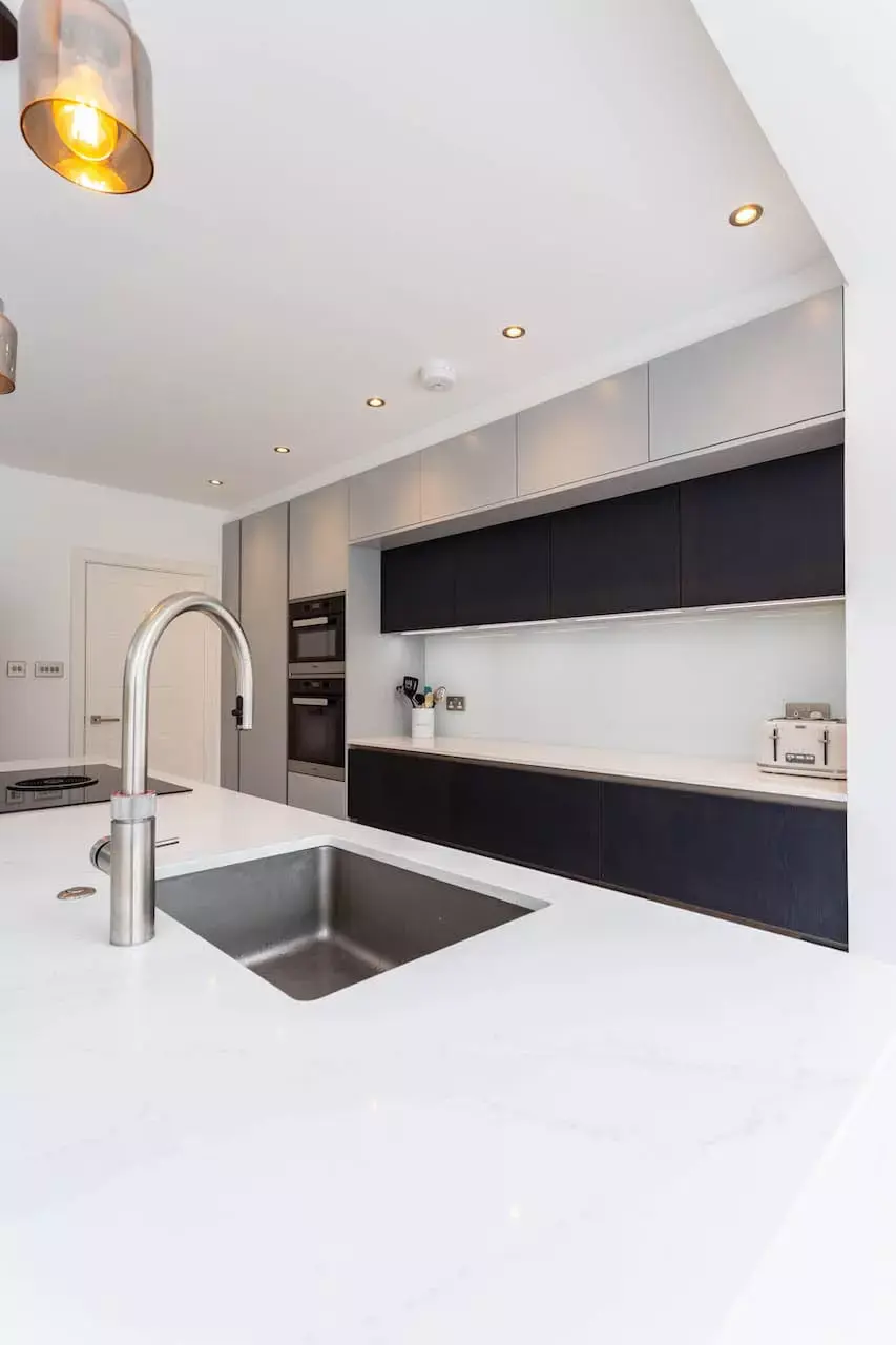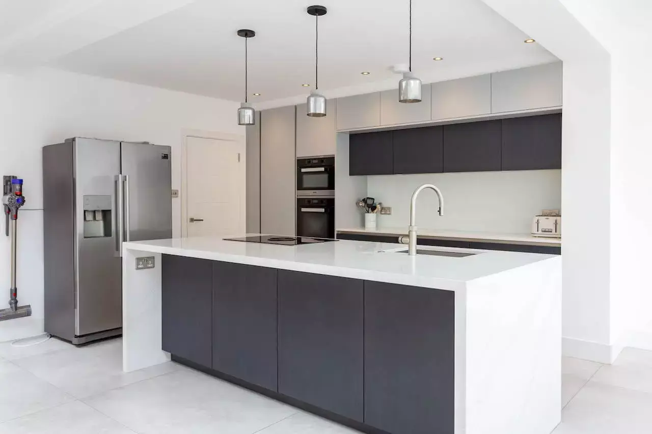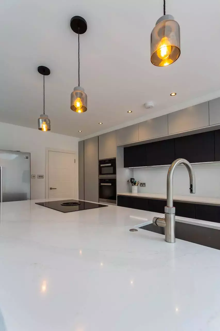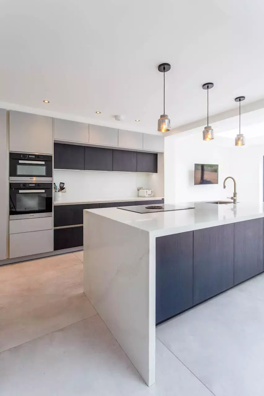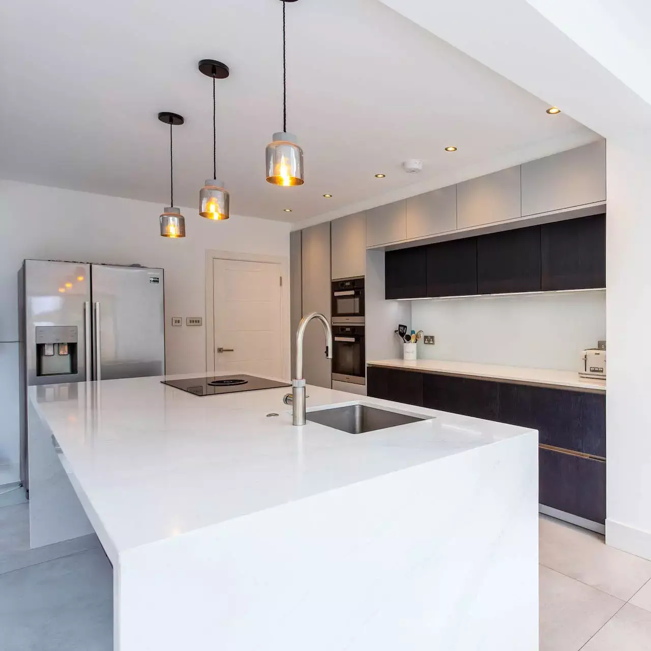 Silestone Calacatta Gold quartz with a thicker 60mm build-up on island to give a substantial presence.