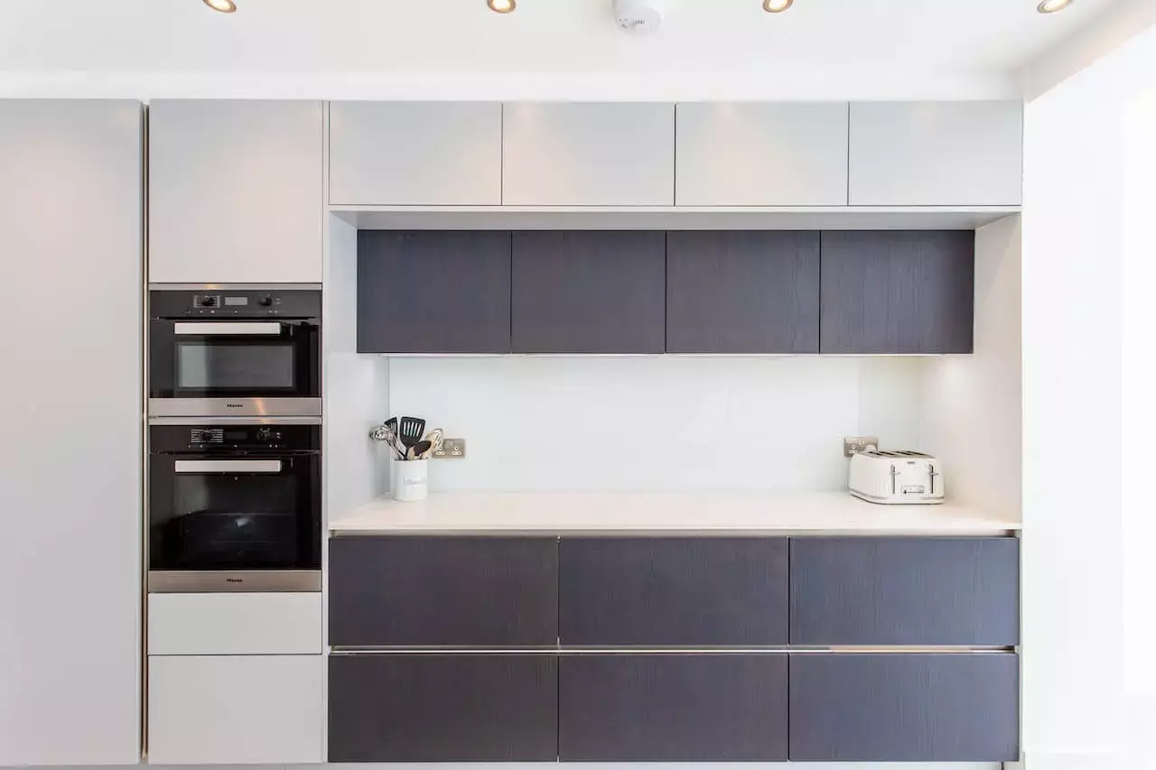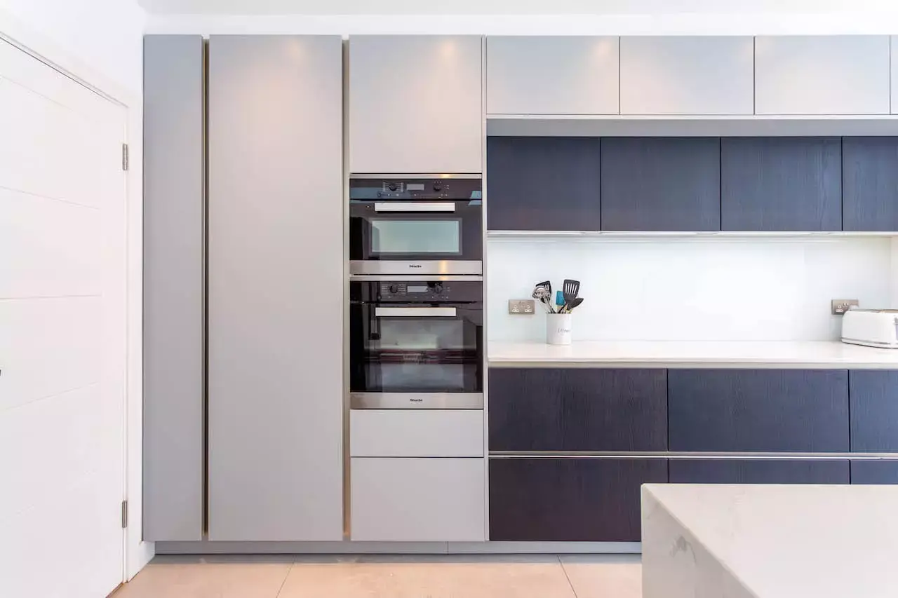 Contemporary two-tone kitchen featuring black oak real wood veneer furniture.